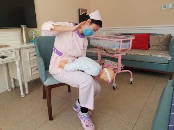 操作方法:立即將患兒取頭低腳高位,俯臥在施救者腿上,讓嬰兒上身前傾45~60度,施救者左手虎口打開、托住嬰兒下頜、打開氣道,用右手掌跟大魚際部位用力扣拍嬰兒背部4—5次,具體位置為背部肩胛骨中間,通過振動使吸入呼吸道的奶汁或痰液排出。