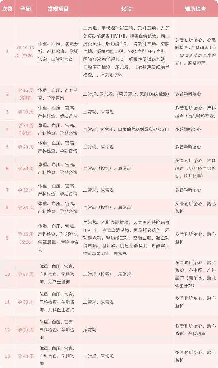 一般情況下,整個孕期準媽媽大約需要進行13次以上的產(chǎn)檢,每個時期關注的重點也是不一樣的。